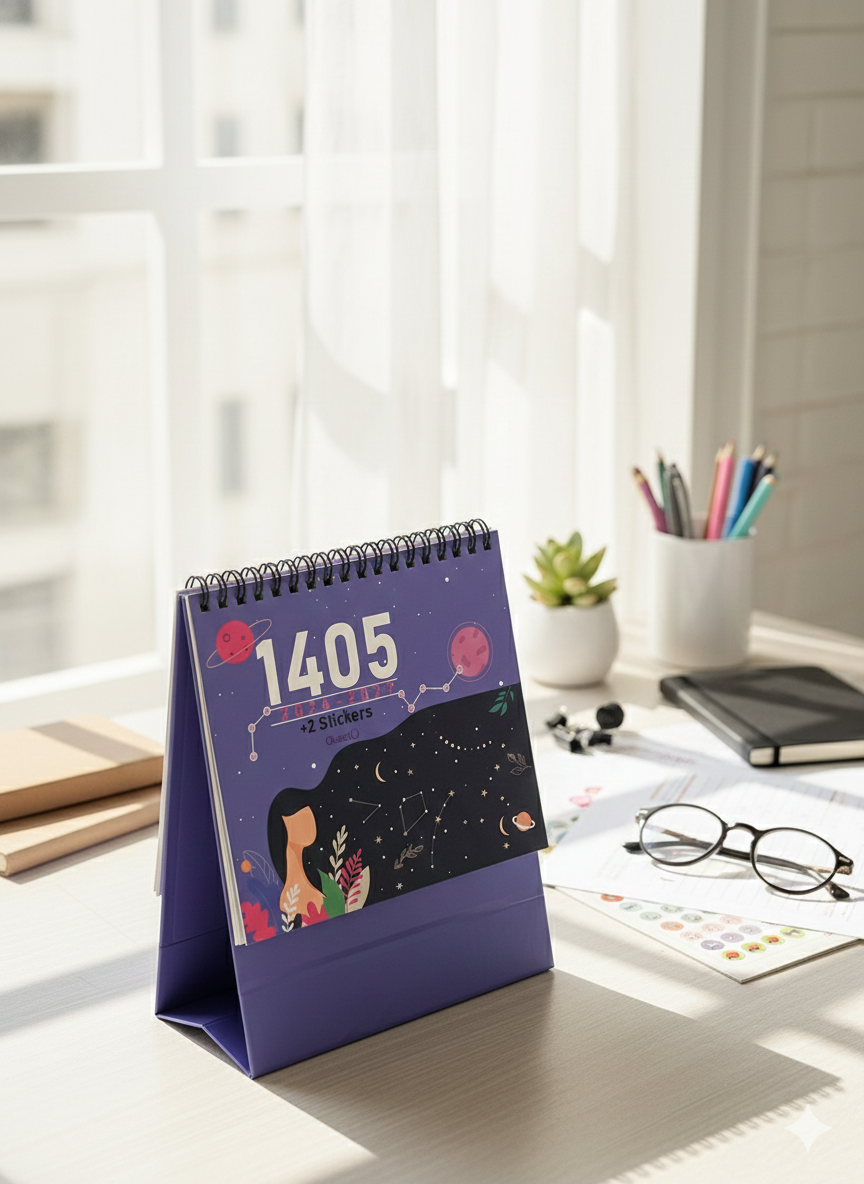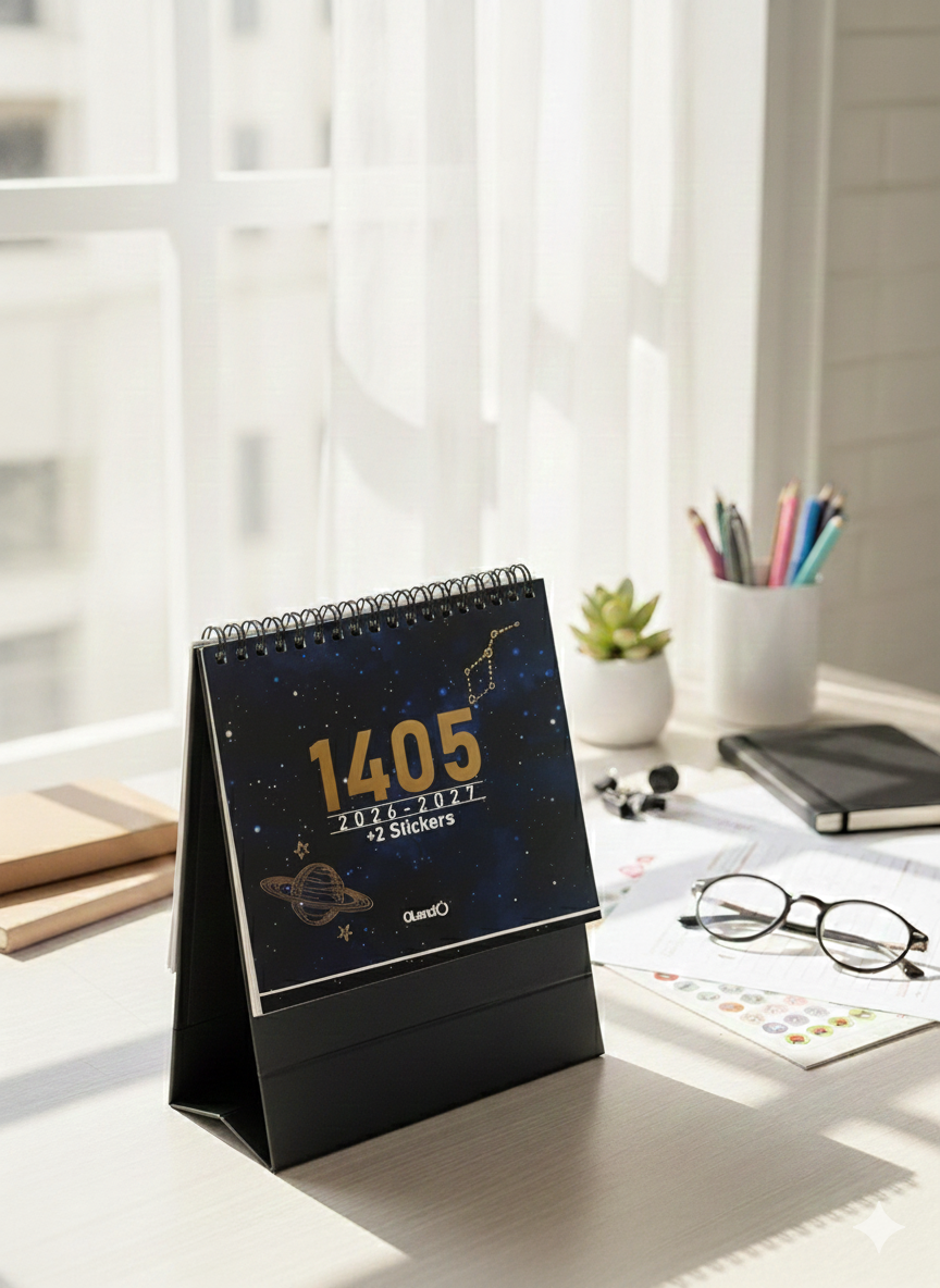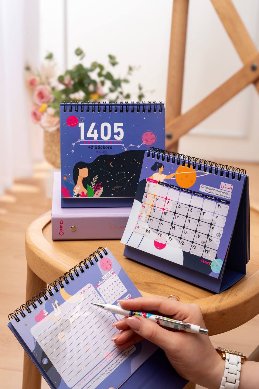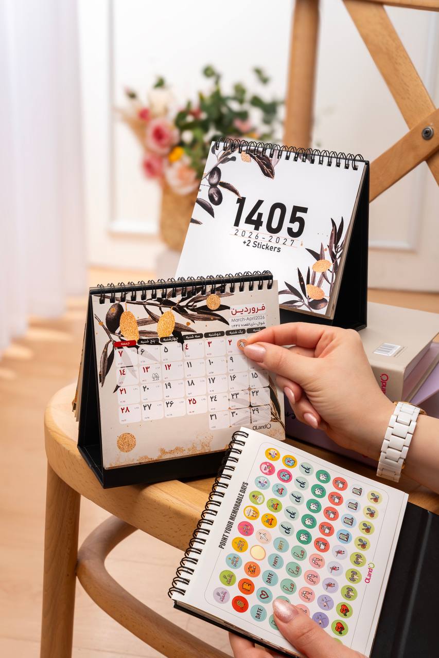 تقویمهای رومیزی ۱۴۰۵ اولند oland تقویمی زیبا و شکیل و دارای طرح روی جلد برجسته و طلاکوب همراه با ۲ برگ استیکر جذاب است که در سایز ۱۵.۵×۱۶ سانتیمتر چاپ شدهاست